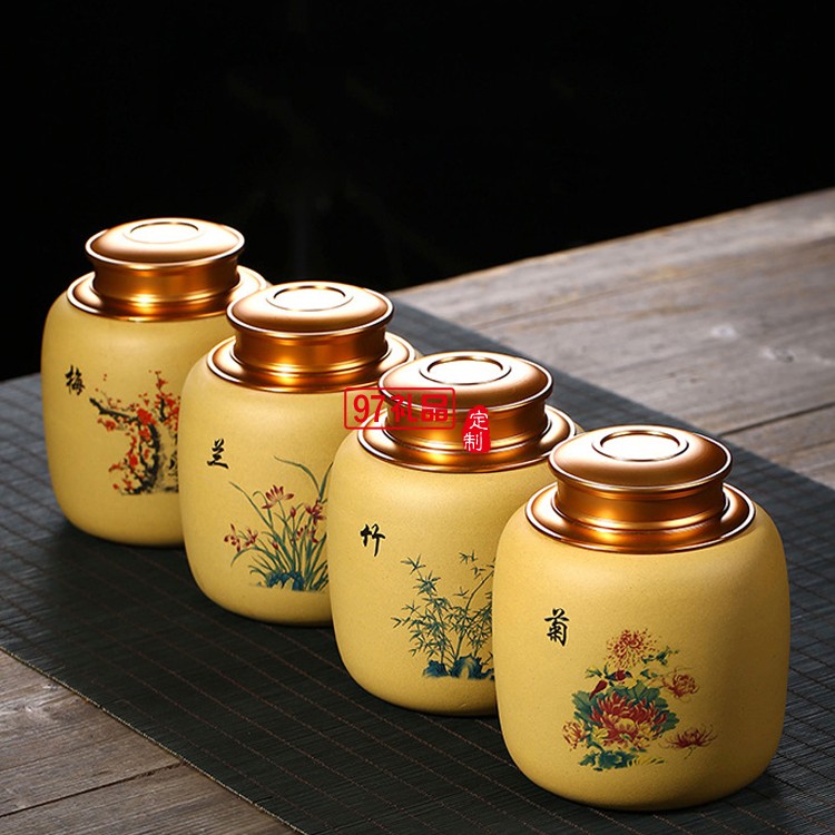 紫砂彩繪梅蘭竹菊茶葉罐原礦段泥陶罐茶葉缸定制公司廣告禮品