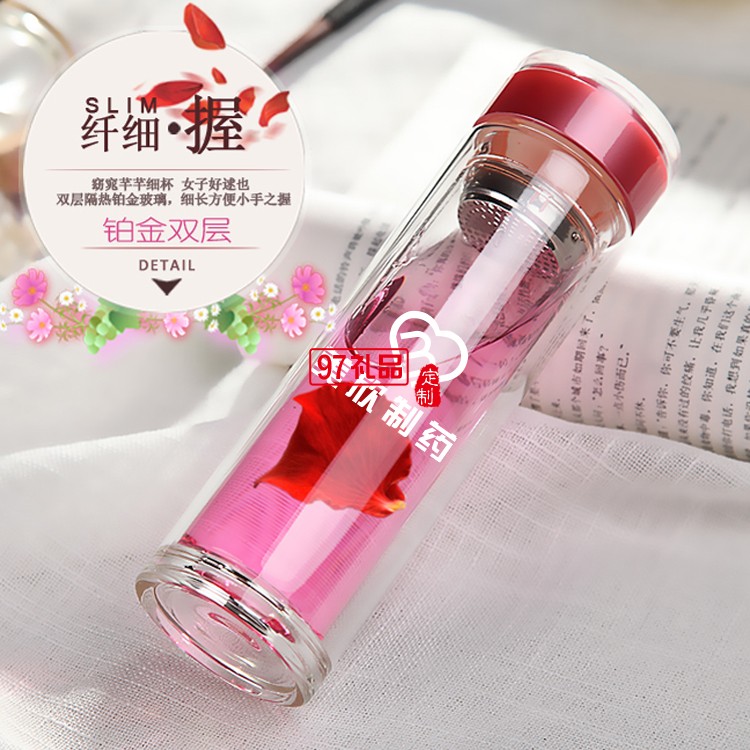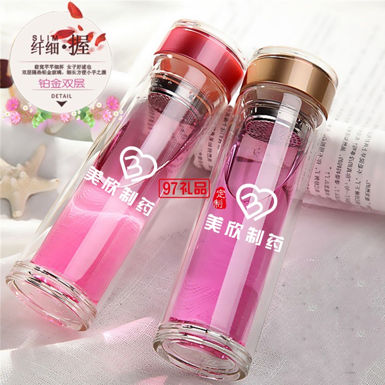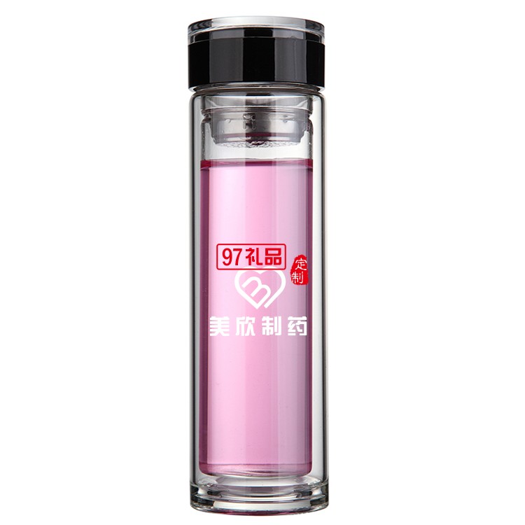 美欣制藥時尚雙層玻璃杯帶蓋濾網(wǎng)水杯高檔禮品杯 直筒爆款杯 可印logo