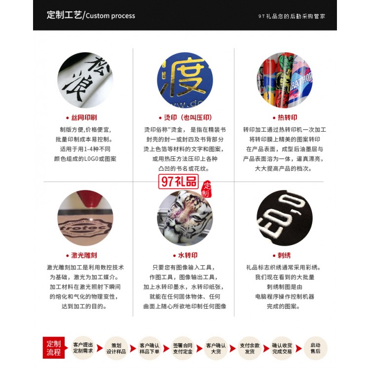 定制流程:選中商品提出定制需求,免費策劃設(shè)計,確認樣品下單,