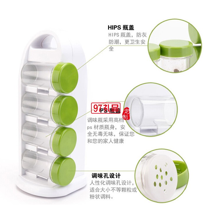 【品名】八瓶調(diào)味架 【產(chǎn)品材質(zhì)】PP+PS 【彩盒尺寸】13.5*12.7*28.9CM 【外箱尺寸】53*42*60CM 【產(chǎn)品功能】旋轉(zhuǎn)瓶蓋,可開關(guān)瓶口,瓶口大小不一,可根據(jù)調(diào)料顆粒分別放置 【產(chǎn)品包裝】一個產(chǎn)品入一彩盒,24個/箱。