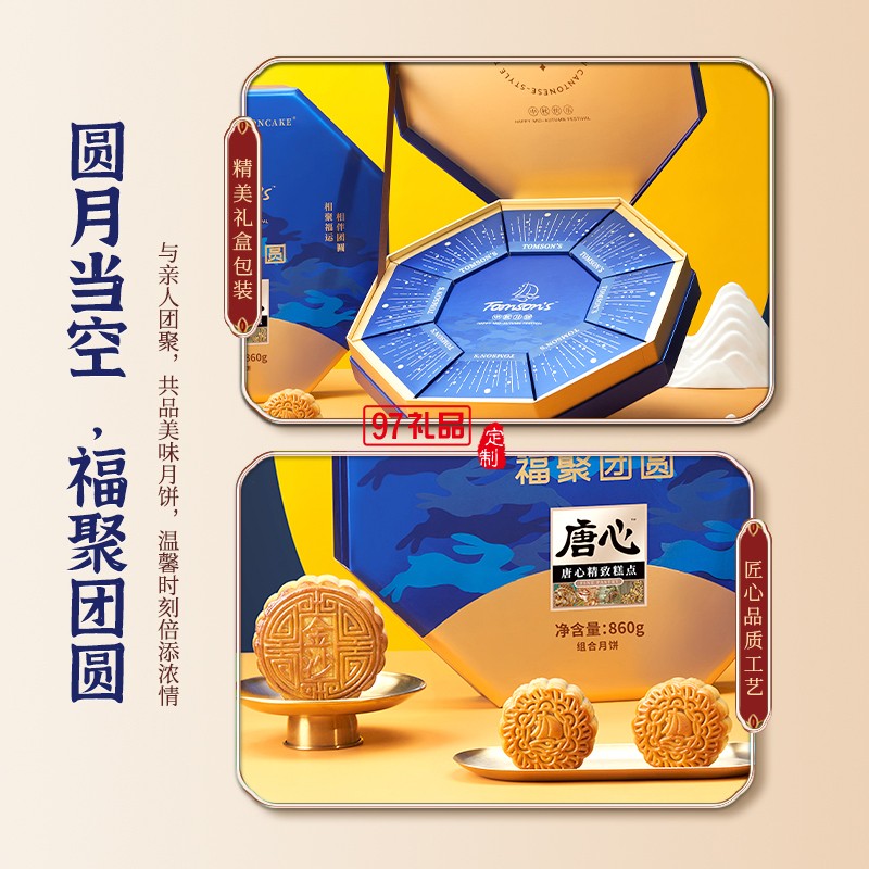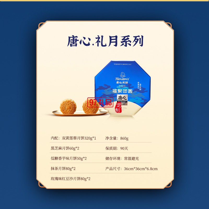 唐心福聚團圓月餅禮盒裝860g中秋送禮蛋黃蓮蓉月餅紅豆沙月餅