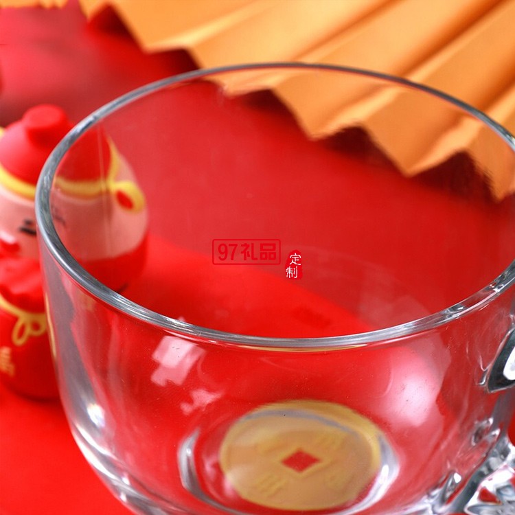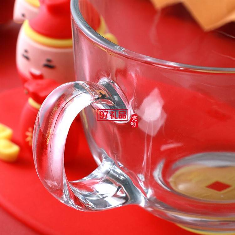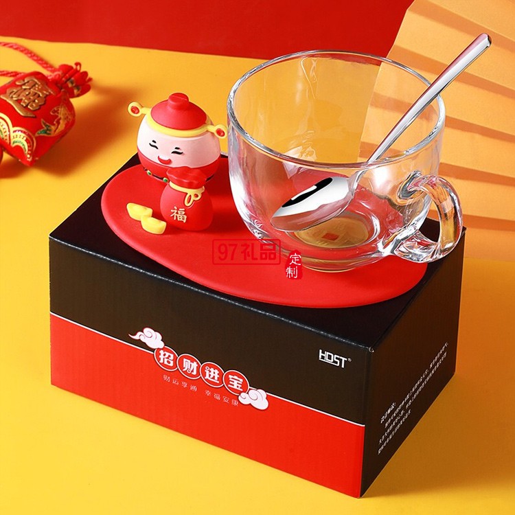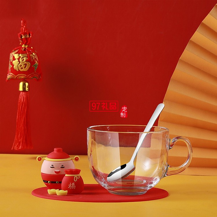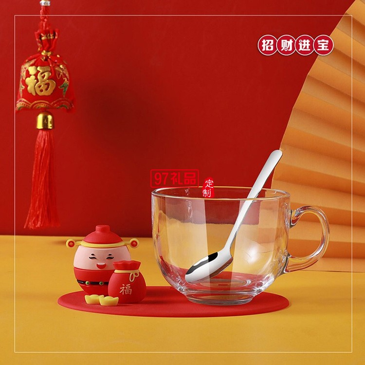 產(chǎn)品特點: 杯子玻璃+PVC杯墊,攪拌勺不銹鋼材質(zhì)。獨特的財神爺和福袋設(shè)計,寓意招財進(jìn)寶。原創(chuàng)設(shè)計,圖案可定制。