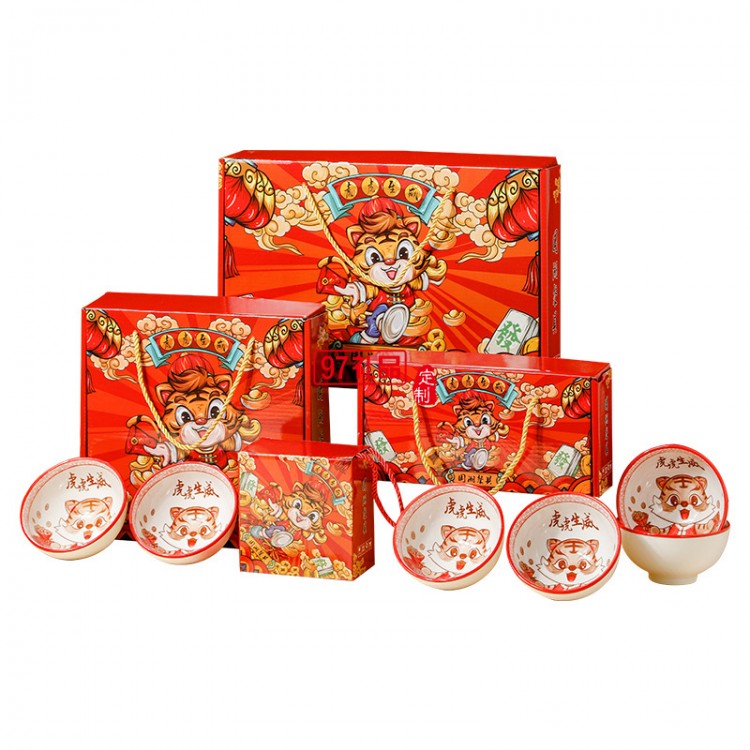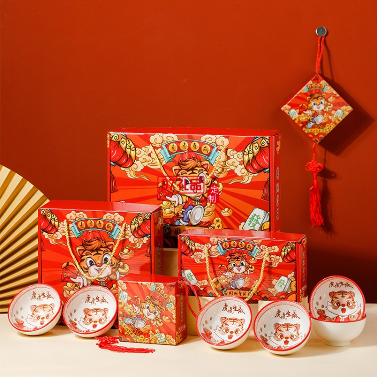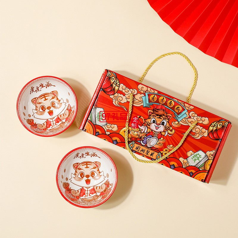 虎虎生威國(guó)潮陶瓷碗套裝活動(dòng)開業(yè)伴手禮虎年禮品碗陶瓷餐具禮盒裝