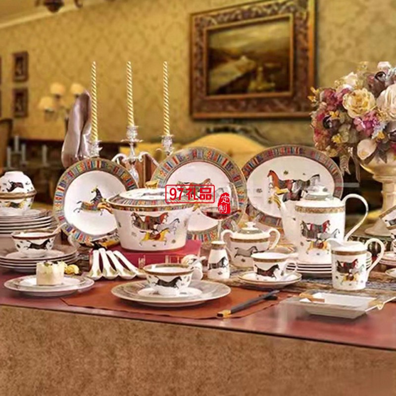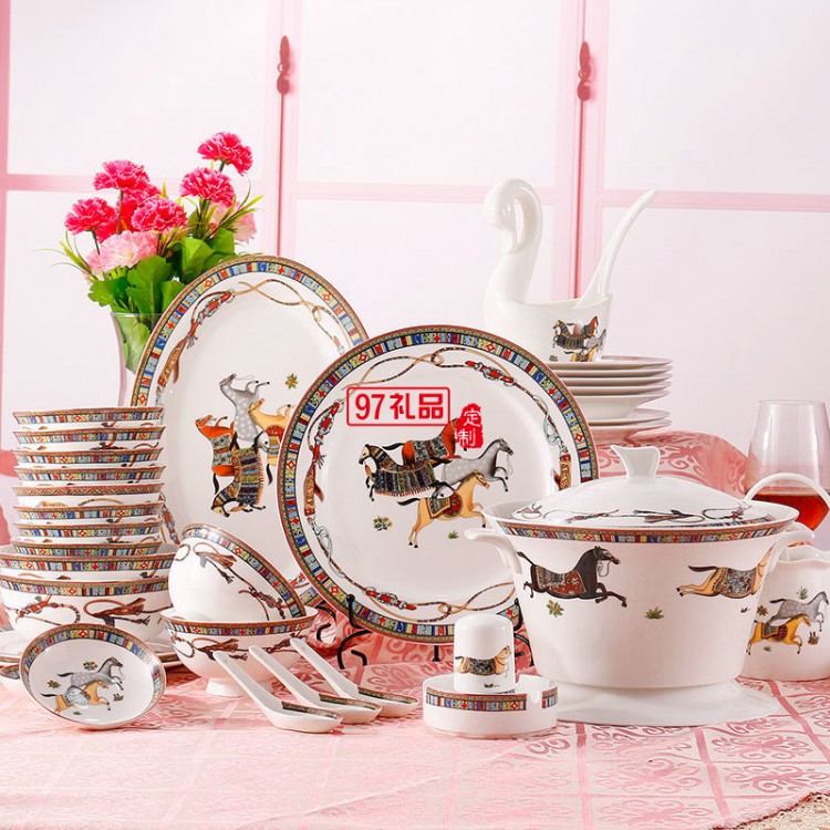 HERME愛(ài)馬60頭餐具套裝禮盒碗盤碟景德鎮(zhèn)骨瓷釉中彩陶瓷喬遷結(jié)婚