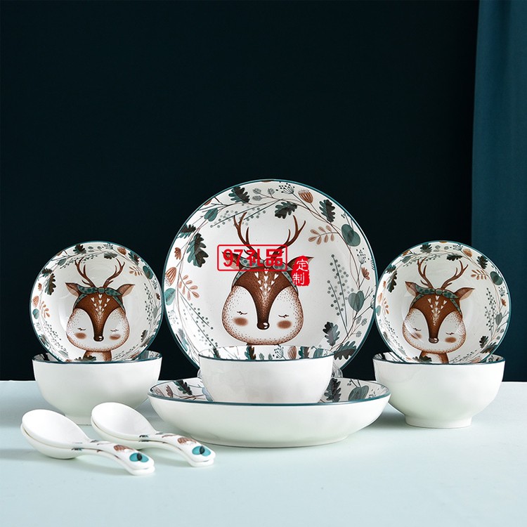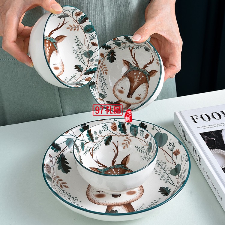 餐具碗勺套裝卡通陶瓷餐具家用碗碟盤套裝一鹿同行禮盒裝
