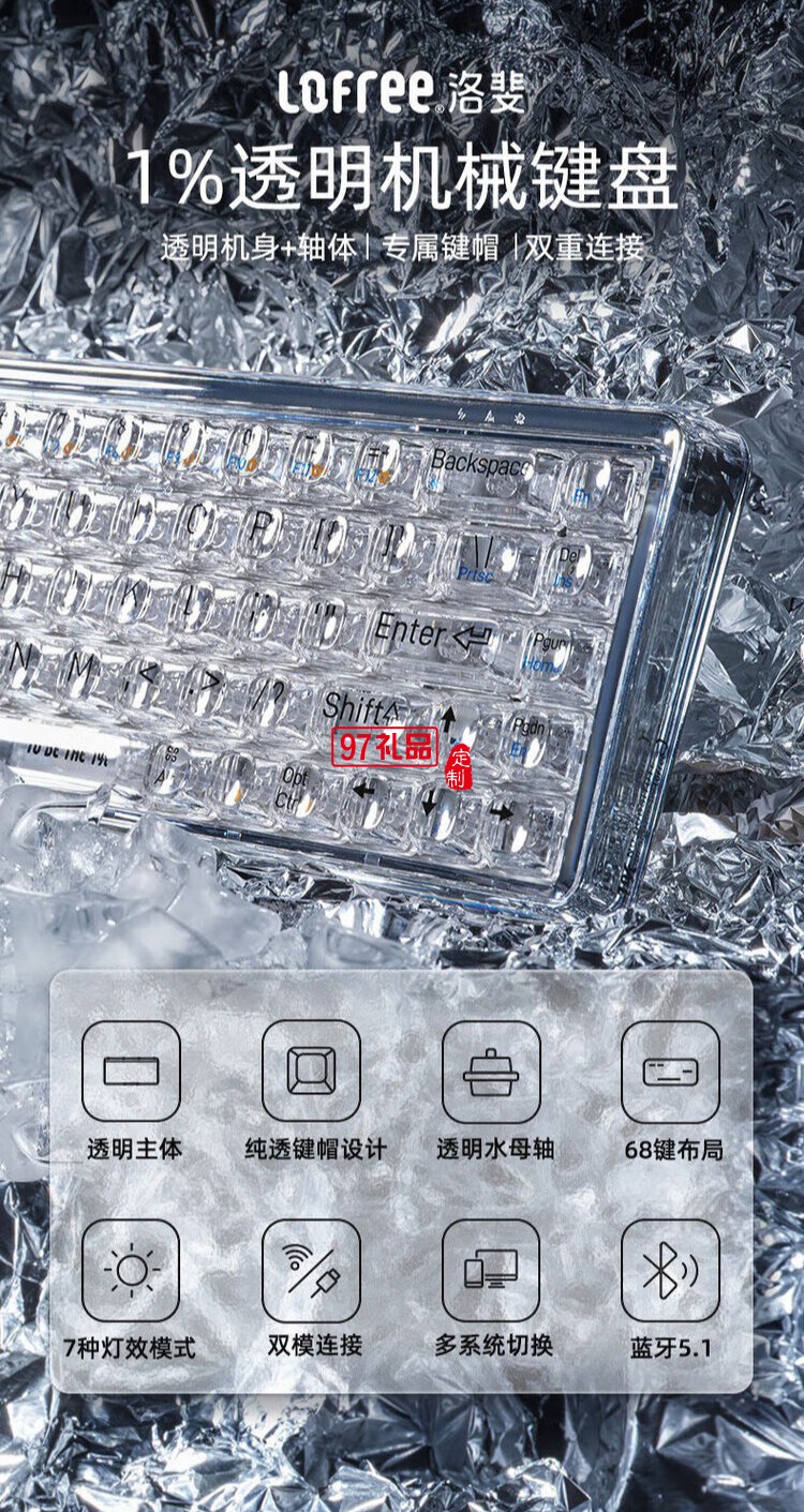 賣點(diǎn)介紹:獨(dú)家肌理效果/7種燈效模式/雙模連接/多系統(tǒng)兼容/透明水母軸/支持熱插拔產(chǎn)品規(guī)格:按 鍵: 68 鍵,MX結(jié)構(gòu)水母軸背 光: LED單色暖光電芯容量: 2000mAh充電時間: 約3小時接 口: Type-c模 式: 藍(lán)牙模式(5.1) / 有線模式藍(lán)牙名稱: 1%@Lofree尺 寸: 320x117.5x46mm重 量: 約812g
