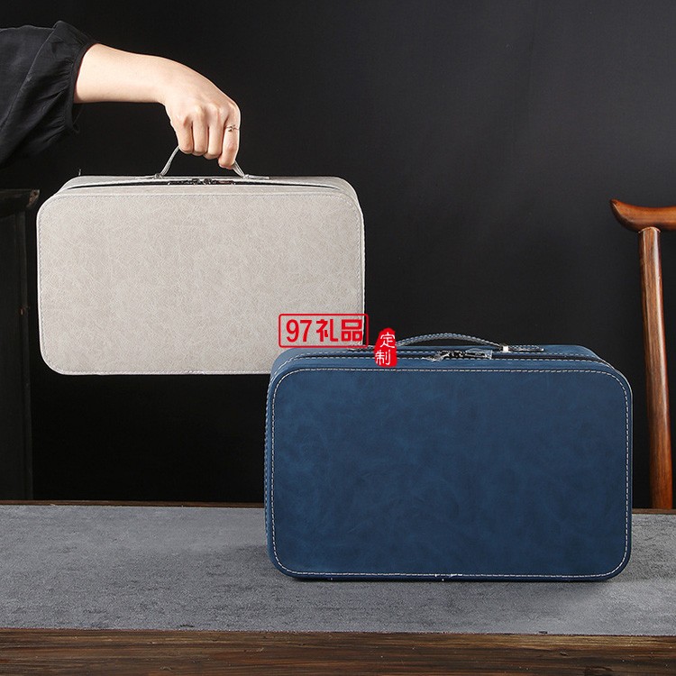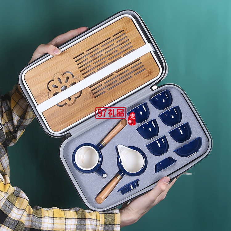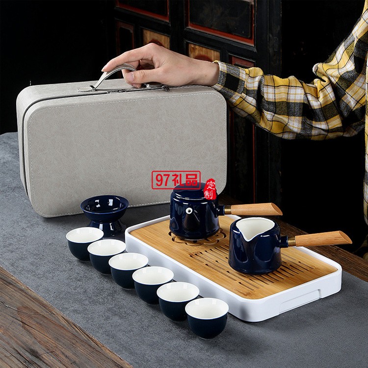霽藍雙側(cè)把壺旅行茶具套裝茶盤便攜家用茶壺戶外辦公陶瓷