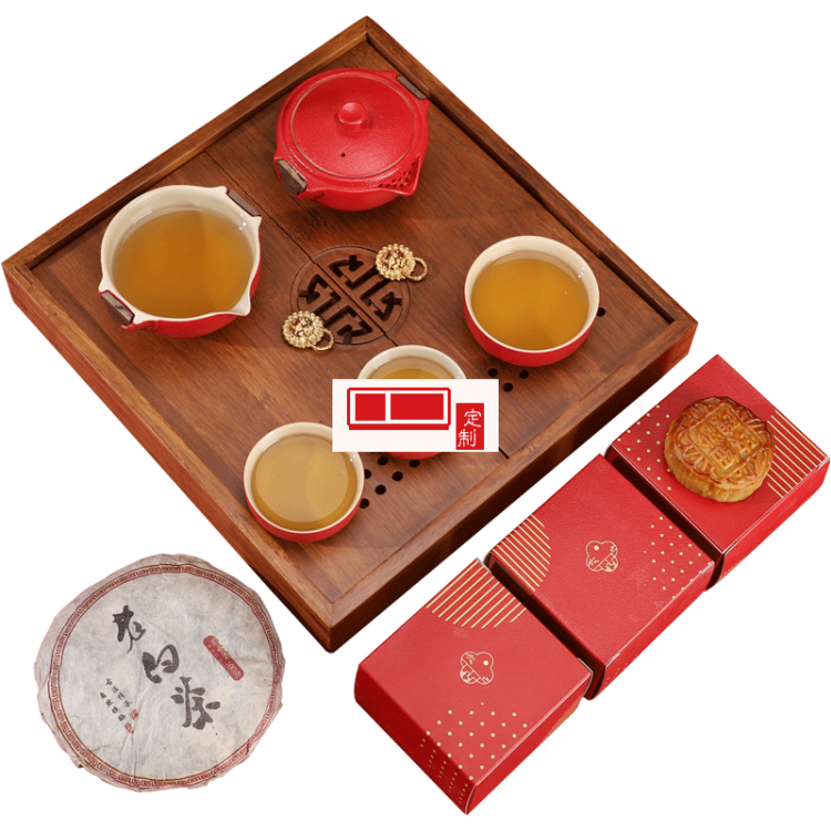 l配置:快客茶器(內(nèi)含茶壺*1,茶海*1,茶杯*3) 月餅*6 茶餅*1 茶盤*1 禮盒*1 手提袋*1